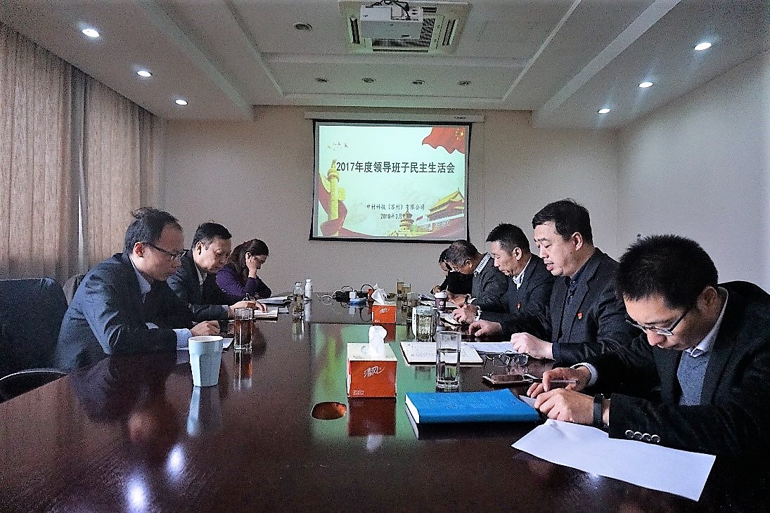 3月7日下午,蘇州有限黨委召開2017年度領導班子民主生活會, 中材科技黨委書記宋伯廬、人力資源部部長徐波濤、黨群工作部副部長高瑋到會指導,蘇州公司領導班子全體成員參加會議。