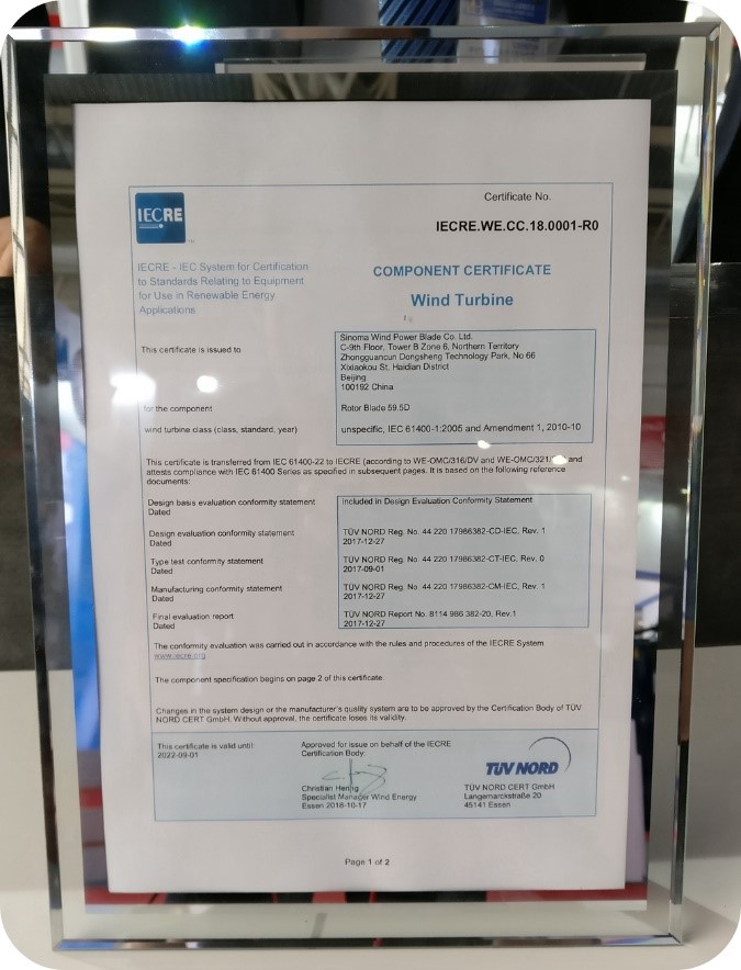 10月18日上午,公司展臺人頭攢頭,共同見證“全球首張IECRE部件證書頒發儀式”,由國際知名認證機構德國TÜV NORD向公司頒發Sinoma59.5D葉片IECRE部件認證證書,這也是國際權威認證體系IECRE頒發的全球首張葉片部件認證證書。