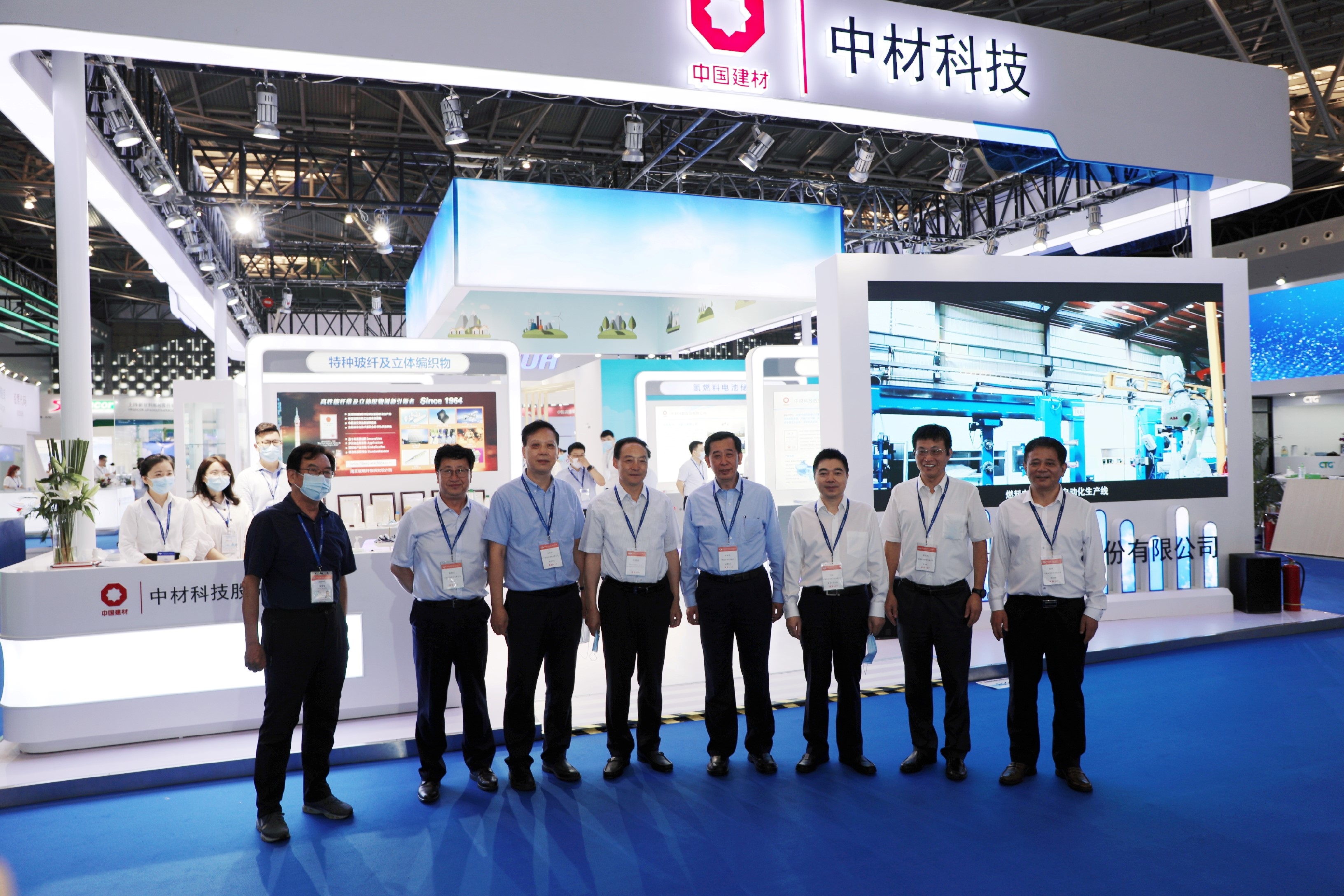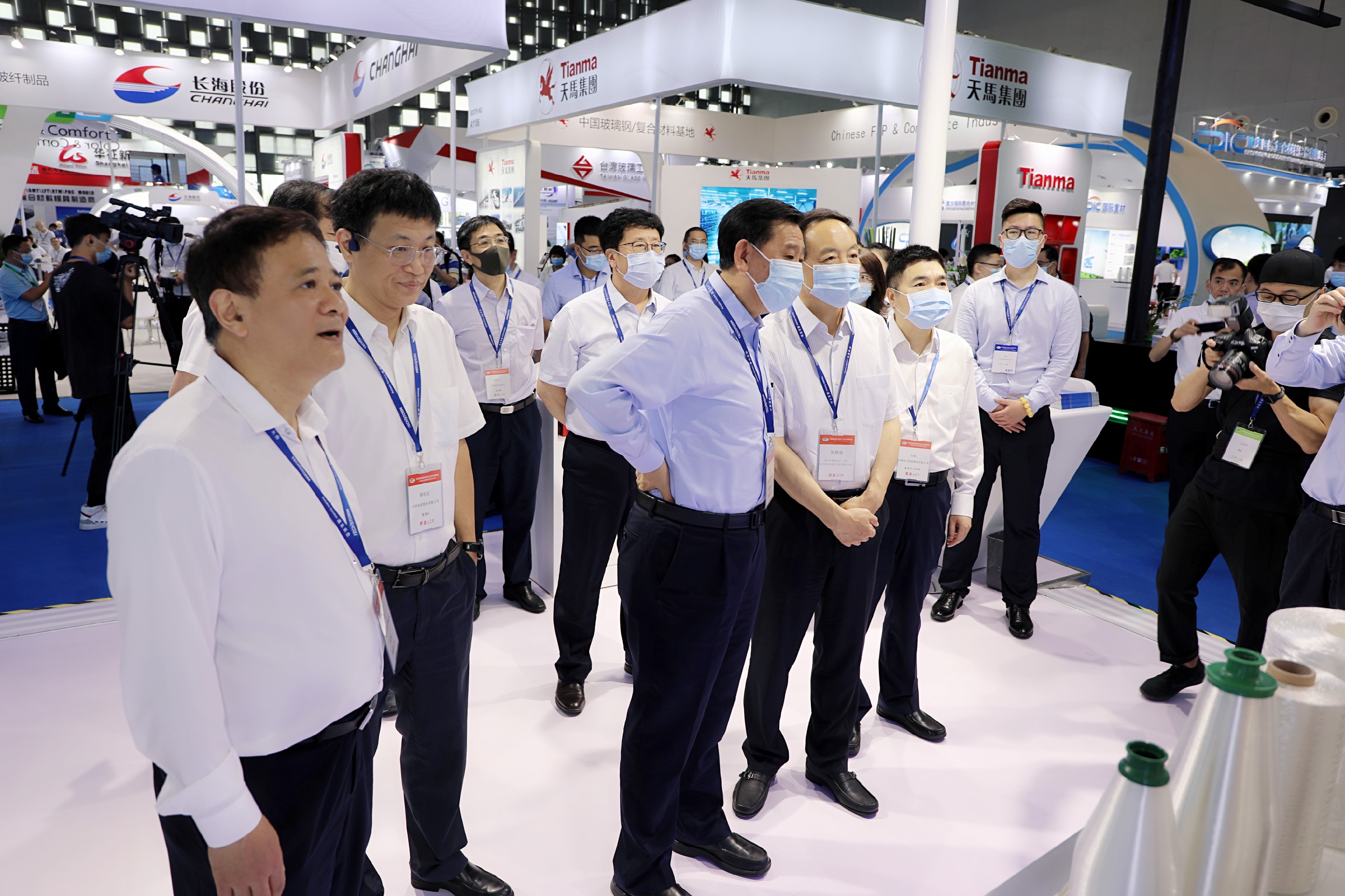 展會開幕后,中國建材集團副董事長李新華,西寧市委副書記、市長、西寧經濟技術開發(fā)區(qū)管委會主任張曉容到我公司參觀展臺、聽取匯報并慰問現場工作人員,中國復合材料集團有限公司黨委書記、董事長兼總經理劉標,公司薛忠民、宋伯廬、趙謙、趙俊山等領導陪同參觀。