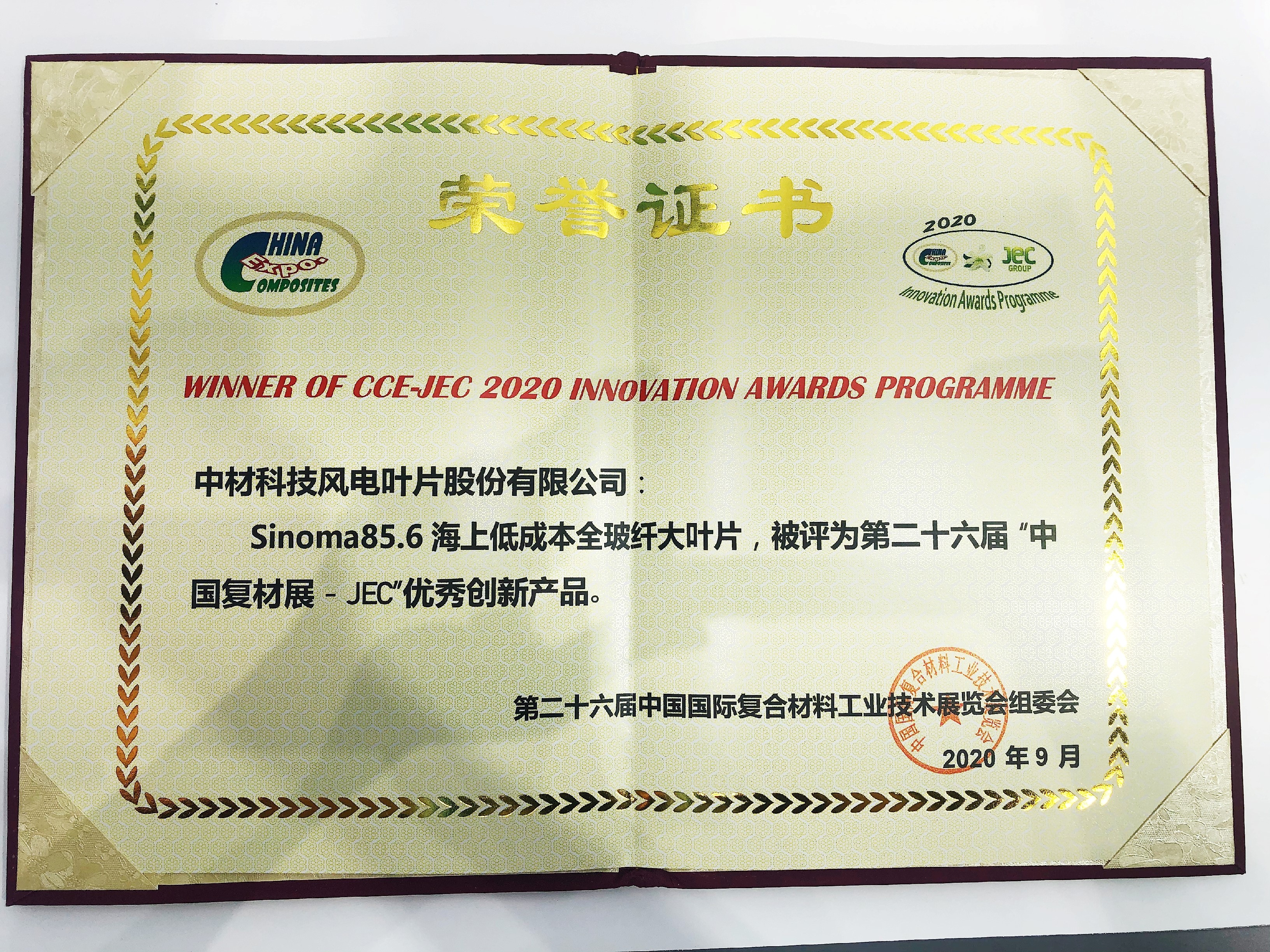 9月2日上午11點,在世博館2號館的新聞發(fā)布區(qū)舉行了隆重的2020 CCE-JEC創(chuàng)新產品頒獎儀式,來自國內外34家企業(yè)的44件創(chuàng)新產品角逐原材料、應用、工藝技術及設備三大類9項大獎。中材科技風電葉片股份有限公司的參展產品“Sinoma85.6海上低成本全玻纖大葉片”被評為第二十六屆“中國復材展-JEC”優(yōu)秀創(chuàng)新產品獎。公司董事長薛忠民參加了頒獎儀式。